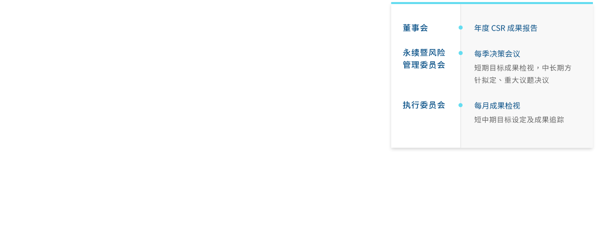 YY易游m6米乐成立永续委员会(2023年更名可持续暨风险管理委员会),作为公司永续发展运作的最高治理机构,并持续策化推动企业永续转型,透过永续长及永续专责单位,统筹中长期永续发展的策略方向。